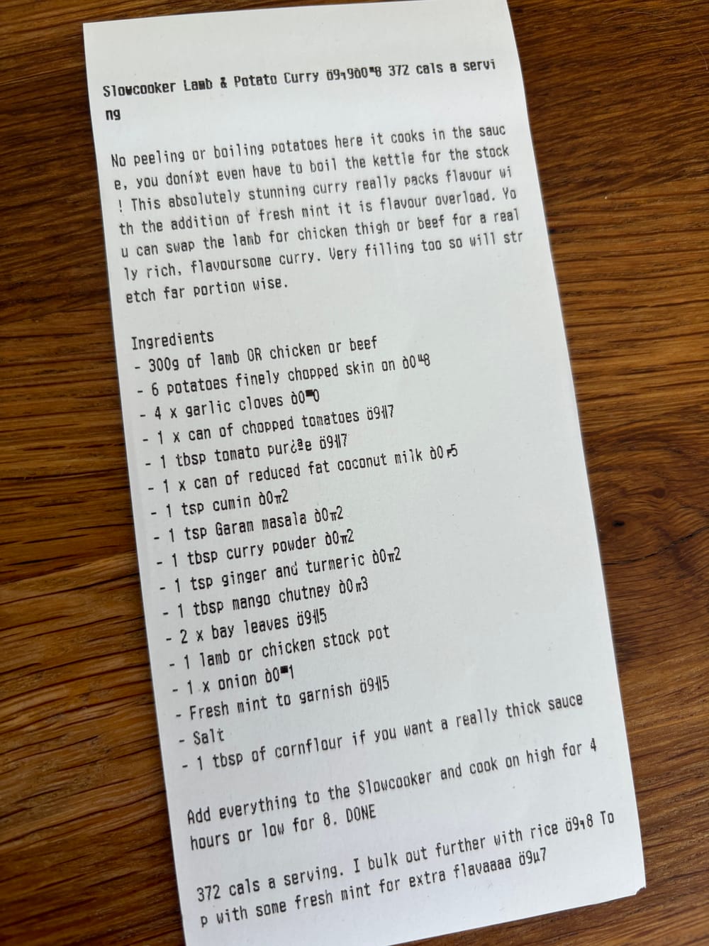 Like many printers, including the Adafruit thermal printer, mine uses the standard ESC/POS command set, so I installed the node-escpos Node.js package to enable programmatic printing. I also set up CUPS, allowing me to print over the network from my laptop and even my iPhone, though it’s still experimental. So far, I’ve configured it to print a daily report with a Bible verse, the weather, and a collection of RSS feeds at 7 AM when I start work (yes, it’s early). I also have it printing selected Mastodon notifications and Met Office weather warnings.Examples of how I use the printer include printing notifications and recipes.